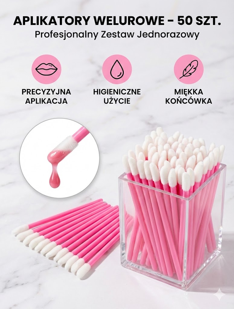Różowe welurowe aplikatory do ust i makijażu to połączenie estetyki beauty z funkcjonalnością, której oczekują zarówno klientki indywidualne, jak i profesjonalistki. Jednorazowa forma gwarantuje wysoki poziom higieny, a miękka, flokowana końcówka umożliwia precyzyjną aplikację kosmetyków.
