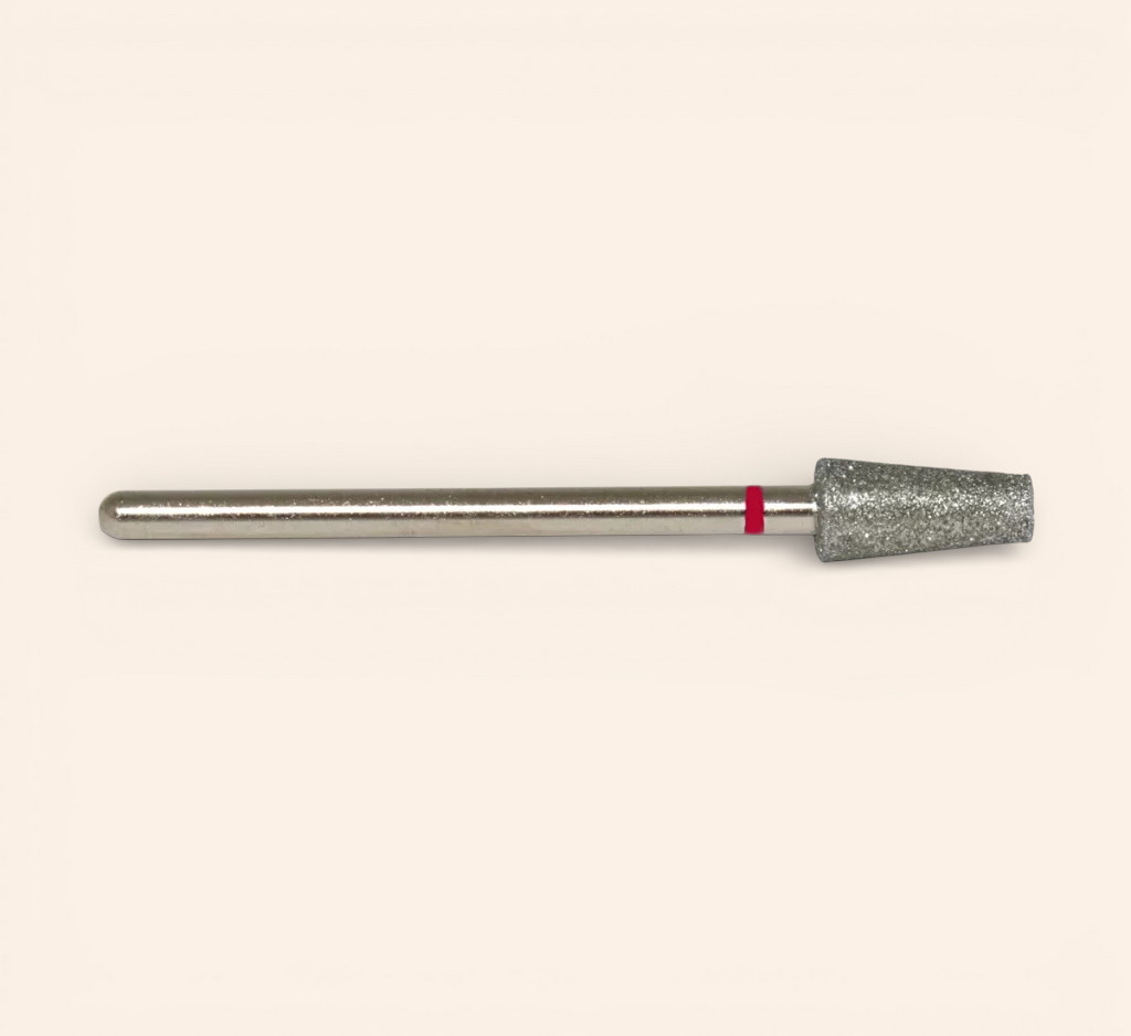 Frez diamentowy ścięty stożek czerwony 050 posiada największą średnicę części roboczej spośród dostępnych w naszym sklepie frezów o kształcie ściętego stożka oznaczonych kolorem czerwonym, wskazującym na delikatny, drobny nasyp diamentowy. Z tego powodu narzędzie jest przeznaczone do precyzyjnej, wykończeniowej pracy przy obróbce paznokci, pozwalając na opracowywanie naprawdę dużych obszarów. Niewątpliwa zaleta tego frezu to ścięta końcówka, umożliwiająca pracę zarówno przy skórkach u stóp, jak i u rąk.